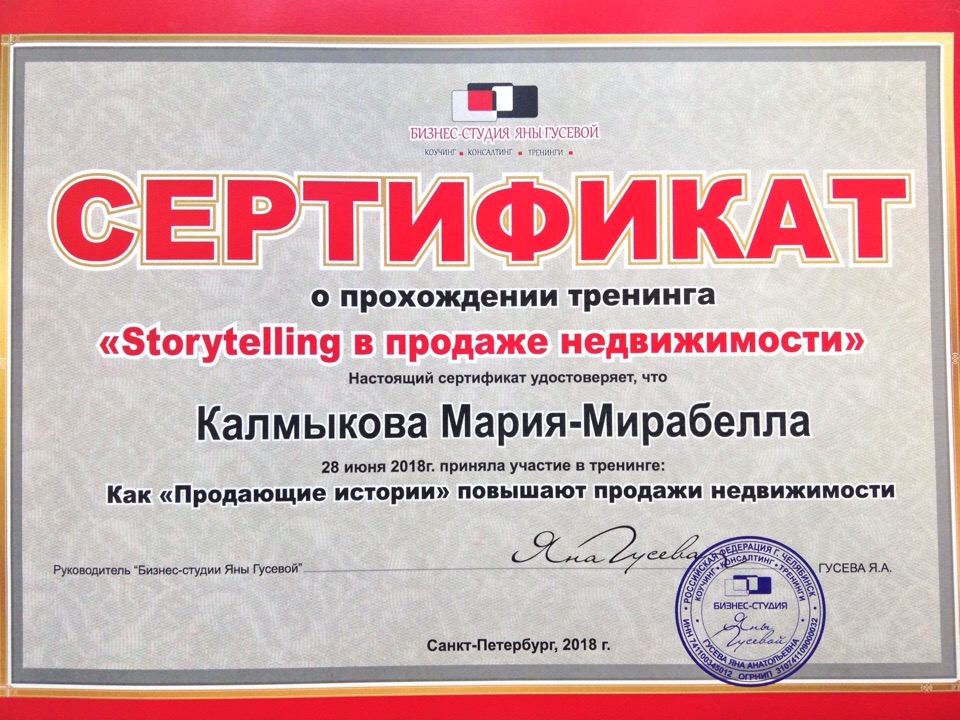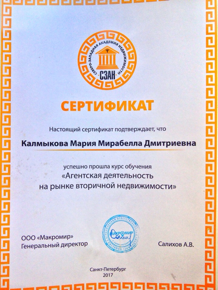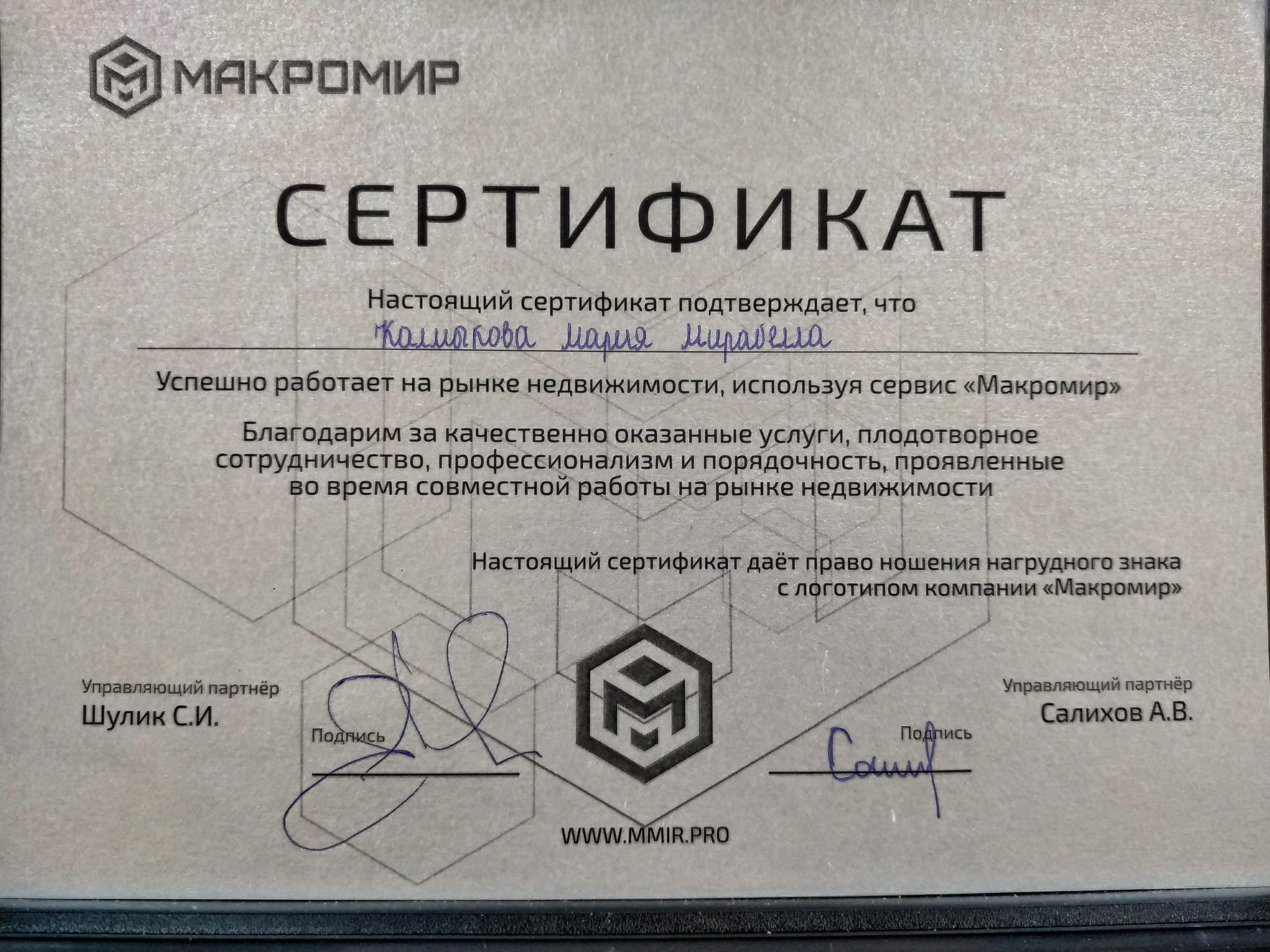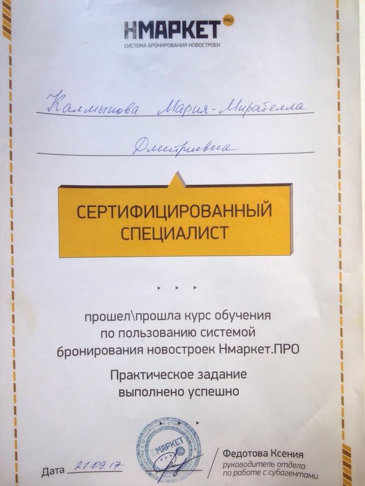 Хочу оставить отзыв о Марии-Мирабелле Калмыковой. Изначально стояла задача купить современное комфортное жилье и с этой задачей мы справились только усилиями Марии. Сделка прошла грамотно и гладко, по итогу было приобретено жилье соответствующее всем изначальным параметрам. Если были какие-то возможности сэкономить, отстоять свои интересы - Мария их не упускала. Все документы были тщательно проверенны, все нюансы учтены. Спасибо большое Марии-Мирабелле за проделанную работу. Если хотите понаблюдать за работой профессионала в своей области - обращайтесь к Марии.