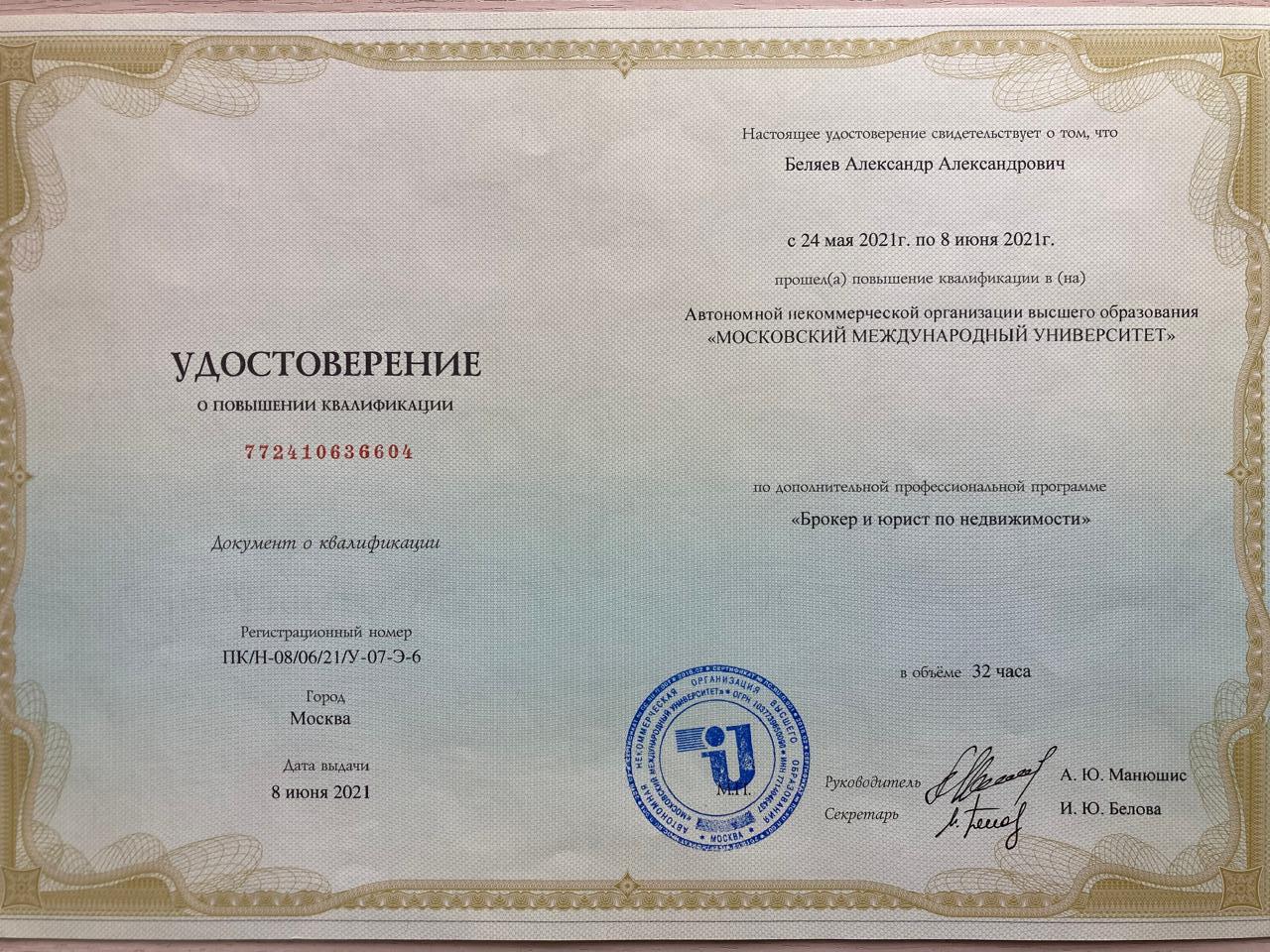 Образование высшее техническое, дополнительное - МВА. Аттестат гильдии риелторов Москвы, квалификация "Специалист по недвижимости - агент". Удостоверение о повышении квалификации по специальности "Брокер и юрист по недвижимости" Московского Международного Университета № 772410636604. Сертификат "Мастер аукционных продаж недвижимости" №50.