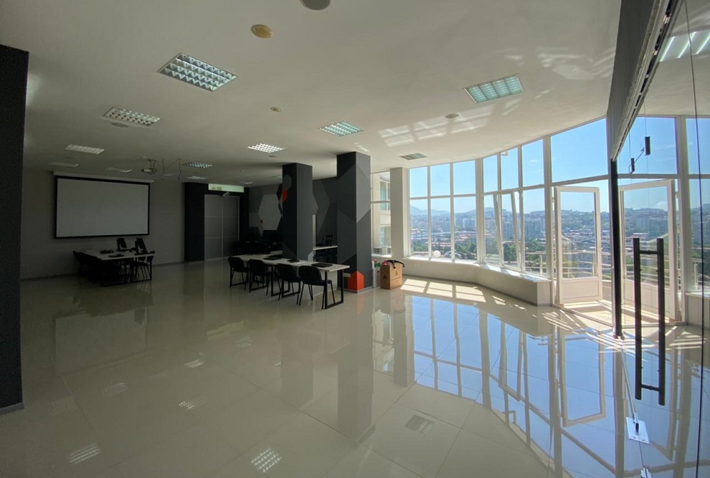 Что здесь есть? Большое изолированное помещение для ресепшн с зоной ожидания. Рабочий зал с большим панорамным окном и видом на центральный район Сочи. Две переговорные и 1 кабинет, который при необходимости также может быть переговорной. В офисе много света и воздуха, а еще у окна располагается лаундж зона с мягкими подушками и диванами, где можно отдохнуть, поговорить по телефону, пообщаться или поработать в расслабленной обстановке. В общей зоне на стене есть экран и установлен проектор, так что в считанные минуты здесь можно организовать сцену для выступления или включить видеоматериалы. Вот оно, идеальное место для комфортной работы!